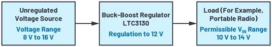 圖1所示為這類應(yīng)用的系統(tǒng)示意圖。便攜式無線電設(shè)備由電池提供電壓。負(fù)載可以接受介于10 V和14 V之間的電壓,但電壓源的輸出范圍可能為8 V至16 V。那么內(nèi)插的降壓-升壓穩(wěn)壓器可以在輸出端將電壓轉(zhuǎn)換為12 V。如果電源電壓略低于12 V,轉(zhuǎn)換器采用升壓模式工作,如果電源電壓高于12 V,則采用降壓模式工作。