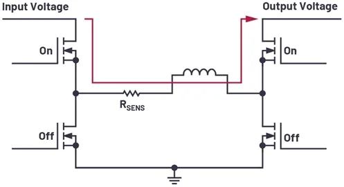 圖2所示為配有直通模式的新 LT8210 降壓-升壓控制器電路的功率級(jí)。在這種模式下,H橋的兩個(gè)高端開關(guān)永久開啟,兩個(gè)低端開關(guān)永久關(guān)閉。通過這種方式,根據(jù)電流和電壓情況,可以實(shí)現(xiàn)近乎100%的效率。