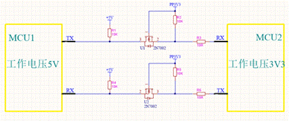 先說一說這個電路的用途:當(dāng)兩個MCU在不同的工作電壓下工作(如MCU1工作電壓5V;MCU2工作電壓3.3V),那么MCU1與MCU2之間怎樣進行串口通信呢?很明顯是不能將對應(yīng)的TX、RX引腳直接相連的,否則可能造成較低工作電壓的MCU燒毀!