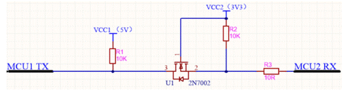 該電路從MCU2到MCU1方向,數(shù)據(jù)傳輸,達到了電平轉(zhuǎn)換的效果。