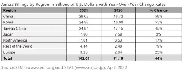 國際半導(dǎo)體產(chǎn)業(yè)協(xié)會SEMI發(fā)布《全球半導(dǎo)體設(shè)備市場統(tǒng)計(jì)報告》(Worldwide Semiconductor Equipment MarketStatistics (WWSEMS) Report)指出,2021年全球半導(dǎo)體制造設(shè)備銷售額激增,相比2020年的712億美元增長了44%,達(dá)到1026億美元的歷史新高。其中,中國大陸地區(qū)再度成為全球最大的半導(dǎo)體設(shè)備市場。
