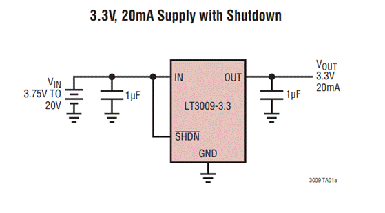 Devices(ADI)的LT3009,就是一款可以同時滿足微安(uA)級靜態(tài)工作電流與20毫安(mA)大驅(qū)動能力的LDO芯片。具體來看,LT3009無負載靜態(tài)電流為3uA,可以在280mV壓差(輸入/輸出)情況下提供20mA輸出電流,輸入電壓范圍為1.6V至20V,輸出電壓范圍為0.6V至19.5V。此外,LT3009僅需要1uF的電容就可以保證輸出電源的穩(wěn)定性和瞬時響應,內(nèi)部集成了限流、限溫、電池接反保護和反向電流保護等防護功能,可有效保證便攜設備的用電安全。
