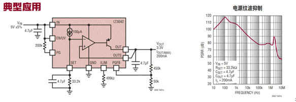圖8:LT3042的典型應用電路(左)和PSRR參數(shù)(右)(圖源:ADI)