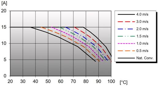 進(jìn)行測試的目的是要使用特定區(qū)域的測試電路板,使其成為可再現(xiàn)的代表性案例,該指定區(qū)域具有指定數(shù)量和厚度的銅層,具體取決于被評估的轉(zhuǎn)換器功率水平。圖中所示的“對向”板對于嘗試更接近地再現(xiàn)真實機(jī)架環(huán)境,以及如何影響靠近電源模塊的氣流方向和湍流都非常重要。為了快速獲得結(jié)果,測量是在本地環(huán)境溫度下進(jìn)行,通常比室內(nèi)溫度高幾度,然后監(jiān)控轉(zhuǎn)換器上指定關(guān)鍵組件的熱區(qū)溫度,以及靠近測試板的特定氣流。在選定氣流速率、標(biāo)稱輸入電壓和負(fù)載電流下,測量熱區(qū)和本地環(huán)境溫度之間的差異以給出溫升,然后將其外推為在溫度超過關(guān)鍵組件要求之前給出的最高本地環(huán)境溫度,從而得到器件降額特性曲線。