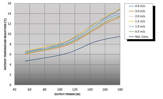 另一個變數(shù)是 DC/DC 轉(zhuǎn)換器是否安裝了基板。通過強(qiáng)制風(fēng)冷,一般可選擇使用“開放式框架”部件,或配備基板的部件。雖然可能沒有傳導(dǎo)冷卻,但基板具有散熱作用,并能夠提供一個平坦的表面來散熱,因此它的效果是有益于散熱。例如,F(xiàn)lex Power Modules 的數(shù)據(jù)表明,在高負(fù)載和高氣流速度下,安裝基板與未安裝基板相比,PKU4213D 產(chǎn)品熱區(qū)最多可降低 15℃ 左右(圖 3)。