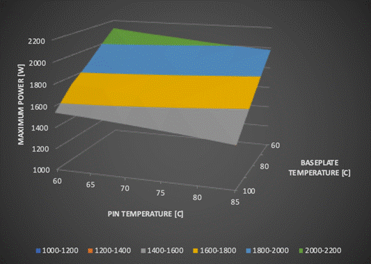 Flex Power Modules 正在推廣另一種確定 DC/DC 可用功率的替代方法,它是通過提供與模塊本身限制更密切相關(guān)的數(shù)據(jù)實現(xiàn)。在實際應(yīng)用中,如果指定了引腳和基板最高溫度,則 通過Flex Power Modules收集的 DC/DC 內(nèi)部熱阻和物理測量數(shù)據(jù)可以更準(zhǔn)確地了解最大可用功率,這樣能夠?qū)τ脩?PCB 結(jié)構(gòu)及其熱阻和氣流特性更加確定。高溫下的損耗變化會自動包含在內(nèi),因為指示的最大可用功率是通過增大負(fù)載使關(guān)鍵組件熱區(qū)溫度達(dá)到最大值來計算。展示數(shù)據(jù)的最好方式是以三軸圖呈現(xiàn),如圖 4 所示,其中所用為Flex Power Modules的BMR491。最終用戶可以簡單地測量應(yīng)用中引腳和基板溫度,并查看可用的功率多大。這與僅根據(jù)降額曲線提供氣流形成鮮明對比,降額曲線可能過于保守,或者冗余不足以將 DC/DC 轉(zhuǎn)換器中的結(jié)溫保持在安全范圍內(nèi)。在最壞情況下,即使溫度不會高到足以觸發(fā)電路保護(hù),但仍會超過推薦值,從而導(dǎo)致可靠性降低和使用壽命縮短。
