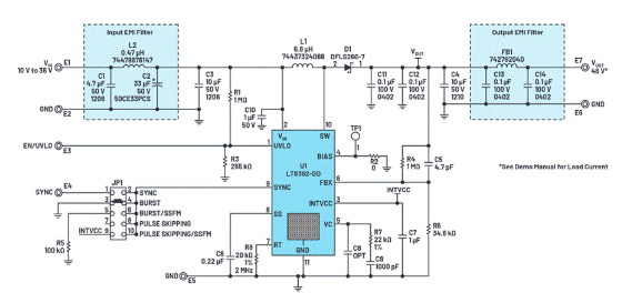 我們可以使用LT8362升壓轉(zhuǎn)換器構(gòu)建一個高性能電源,該轉(zhuǎn)換器采用60 V、2 A開關(guān),工作頻率最高可達2 MHz,且采用3 mm × 3 mm小型封裝。下面的電路基于標準的LT8362演示板 DC2628A, 其原理圖如圖1所示。