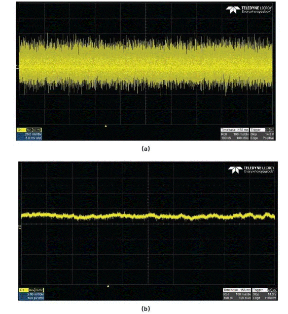 圖3.濾波之前和之后。(a)在C4處(濾波之前)測量時,升壓穩(wěn)壓器輸出的噪聲含量約為0.2%。