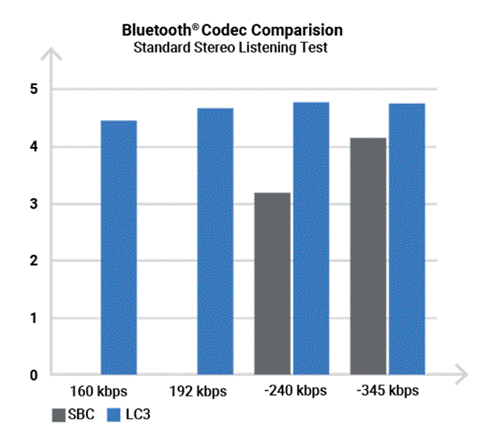 通常,音頻編解碼器用于在發(fā)送方壓縮音頻流并在接收方解壓縮以播放音頻。LE音頻推出了一種新的編解碼器,即“低復(fù)雜度通信編解碼器”(LC3),可實(shí)現(xiàn)高質(zhì)量和低功耗特性。 LC3 以較低的數(shù)據(jù)速率提供更好的質(zhì)量,并可以提供靈活性,權(quán)衡音頻質(zhì)量和功耗之間的選擇。在相同質(zhì)量音頻下,比特率比 SBC 編解碼器低約 50%。