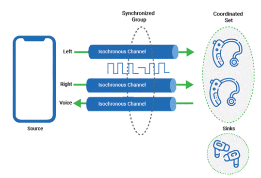 多流音頻:多流音頻在源設(shè)備和一個(gè)或多個(gè)音頻接收設(shè)備之間提供獨(dú)立、同步的多個(gè)音頻流。例如,智能手機(jī)作為源設(shè)備,一個(gè)或兩個(gè)或多個(gè)耳塞作為接收設(shè)備。 LE 音頻充分利用了同步通道功能,提供了各種應(yīng)用,如真正的TWS。此功能允許源設(shè)備和接收設(shè)備之間的多個(gè)音頻流,并且這些流同步精度的誤差大約為10-15 微秒。此功能可以在不同音源設(shè)備之間提供更流暢的切換,并有助于實(shí)現(xiàn)經(jīng)典藍(lán)牙的 A2DP 和 HFP 配置文件的功能。