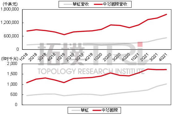 ▲ 2018~2021年每季中芯國(guó)際與華虹半導(dǎo)體營(yíng)收與晶圓銷(xiāo)售量。(Source:公司財(cái)報(bào);拓墣產(chǎn)業(yè)研究院整理,2022.4)