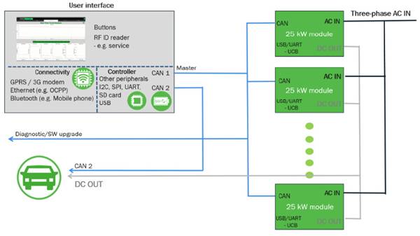 電動汽車直流快充標(biāo)準(zhǔn)的演進(jìn),很顯然會給充電樁的開發(fā)提出新的挑戰(zhàn),這主要體現(xiàn)在兩個方面:一是產(chǎn)品和方案的架構(gòu)需要能夠適應(yīng)不同標(biāo)準(zhǔn)、不同功率等級的要求;二是要有可擴(kuò)展性,能夠跟上標(biāo)準(zhǔn)“升級”的步伐。也就是說,設(shè)計方案需要有足夠的靈活性。