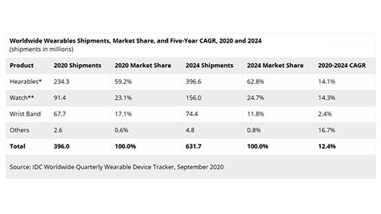 根據(jù)IDC發(fā)布的最新數(shù)據(jù),2020年全球可穿戴設(shè)備的出貨量預(yù)計可達到3.96億臺,與2019年相比增長14.5%。如果從可穿戴細分市場來看,可聽式穿戴設(shè)備(Hearables)占到了總出貨量的近六成,表現(xiàn)十分搶眼。