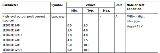 首先來(lái)看一下這個(gè)驅(qū)動(dòng)峰值電流的定義方式。這個(gè)很重要,不同公司的產(chǎn)品往往宣傳說(shuō)法不一樣,所以要參考規(guī)格書(shū)。以下圖1是英飛凌的1EDI系列產(chǎn)品的電流表。比如1EDI60I12AH,我們常說(shuō)它是6A的驅(qū)動(dòng)。事實(shí)上,這個(gè)6A是它的最小值而它的典型值是10A。又比如圖2中的英飛凌新產(chǎn)品1ED3122MU12H,我們稱(chēng)它為10A的驅(qū)動(dòng),而這個(gè)卻是典型值,但后面的測(cè)試條件欄里卻寫(xiě)著VCC2-OUT=15V,這將是最大值里的典型值。繞口了有沒(méi)有?那是不是說(shuō)明兩者的驅(qū)動(dòng)帶載能力一樣的呢?如果不一樣又有什么差異?