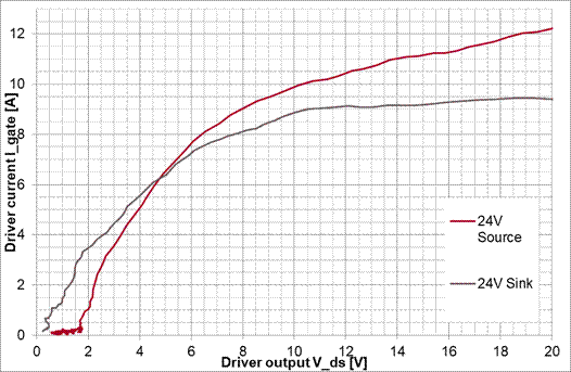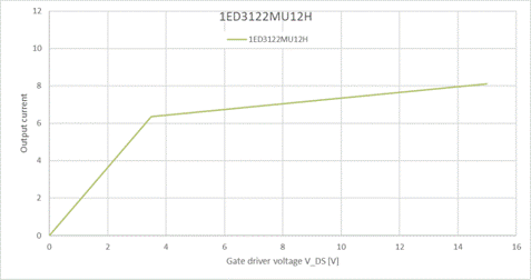 下面我們?cè)賮?lái)看看新款的X3產(chǎn)品情況怎么樣。英飛凌X3系列的產(chǎn)品的輸出部分直接采用新一代的單獨(dú)的PMOS作為開(kāi)通輸出級(jí),如圖8所示。而不是像以前的產(chǎn)品那樣使用PMOS與NMOS結(jié)合的方式(如圖5)。選擇1ED3122MU12H產(chǎn)品繪制如圖9的電流能力曲線(xiàn)(根據(jù)設(shè)計(jì)參數(shù)所得而非實(shí)際測(cè)量)。按照IGBT標(biāo)稱(chēng)電流時(shí)的米勒電壓一般為9~10V來(lái)看,找到橫坐標(biāo)5、6V的時(shí)候電流能力達(dá)到了6A以上。和之前1EDI60I12AF相當(dāng),如果用最大電流值標(biāo)稱(chēng)的話(huà)就是10A了。由此可以看出和以前PMOS/NMOS結(jié)合的產(chǎn)品峰值電流差不多。但是由于PMOS的輸出不受限于Vgs,不會(huì)像圖7的source電流那樣有2V左右的閾值,而是和sink電流一樣可以直接到零!這樣實(shí)際測(cè)的話(huà)曲線(xiàn)會(huì)和圖7的sink電流類(lèi)似,我們暫時(shí)用它假代PMOS的輸出曲線(xiàn)?梢钥吹郊词乖诿桌针娖綍r(shí)兩者的輸出限值一樣都是6A,但是一旦有外加的門(mén)極電阻后,PMOS的輸出能力更加出色,如圖7紅色圈所示。