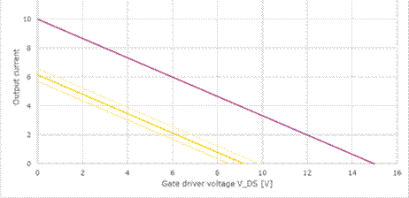 由此可見(jiàn),單純地給出一個(gè)驅(qū)動(dòng)電流值是無(wú)法直接判斷帶載能力的。我們需要更多的信息,比如芯片內(nèi)部末級(jí)輸出形式、定義值的點(diǎn)在哪?更為重要的是,功率器件的門(mén)極電阻影響極大。如果外部電阻很大的話(huà),會(huì)分掉更多的壓降,體現(xiàn)在圖7的電阻斜率更小,使得工作點(diǎn)左移,更近原點(diǎn)。如果這時(shí)候還看15V的電流能力就變得毫無(wú)意義了。而使用獨(dú)立的、電流更大的PMOS,可以解決NMOS作為共漏極輸出所需要的門(mén)檻電壓?jiǎn)栴},輸出特性線(xiàn)整體左移,疊加外電阻影響后,實(shí)際可以獲得更高的電流。