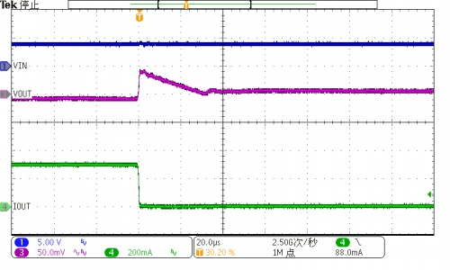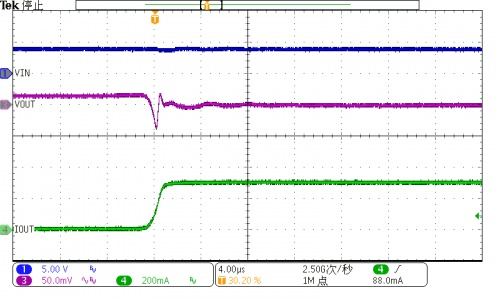 另外,DVDD供電電源需有足夠的響應速度,以應對圖像傳感器瞬時變化的負載特性。如下圖所示,WL2848D擁有快速的負載響應特性。