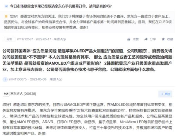關(guān)于蘋果取消京東方手機(jī)屏幕訂單一事,京東方曾在投資平臺多次回應(yīng)“不予置評”,并強(qiáng)調(diào)公司AMOLED產(chǎn)線正常運(yùn)營,年度目標(biāo)沒有變化。