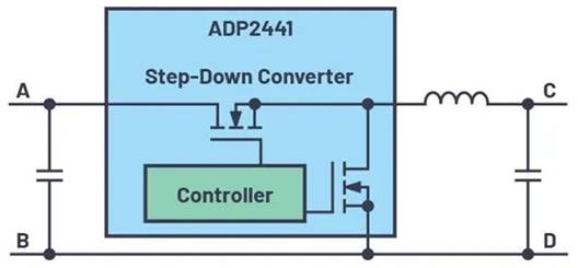 圖1中未體現(xiàn)端子的噪聲特性。不同的開關(guān)穩(wěn)壓器拓撲在2端口網(wǎng)絡(luò)端子處具有不同的噪聲特性。圖2顯示適合工業(yè)應(yīng)用的ADP2441通用降壓轉(zhuǎn)換器。它可以將24 V輸入電壓轉(zhuǎn)換為3.3V輸出電壓。采用這種拓撲時,可以看出,輸入側(cè)會產(chǎn)生脈沖電流,因此噪聲很大。當(dāng)ADP2441上的高端開關(guān)導(dǎo)通時,電流流入端子A。當(dāng)此開關(guān)關(guān)斷時,沒有電流流經(jīng)節(jié)點A。但是,輸出端C的噪聲很小。其中,輸出路徑中的電感可確保輸出端沒有脈沖電流。