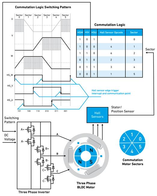 如今,計算機程序之類的軟件算法(為執(zhí)行具體任務而設計的一組指令)開始用于控制 BLDC 和 PMSM 電機。這些軟件算法通過監(jiān)控電機運行來提高電機效率,降低運行成本。算法中的一些主要功能包括電機初始化、霍爾傳感器位置檢測以及用于提高或降低電流基準的開關信號檢查。