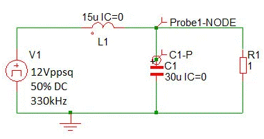 在圖 1中,降壓轉(zhuǎn)換器電源系統(tǒng)由一個 12V 峰峰值方波發(fā)生器表示,該發(fā)生器具有 50% 占空比和 330kHz 頻率。LC 濾波器由一個 15µH 電感器和一個為 1Ω 負(fù)載供電的 30µF 電容器組成。