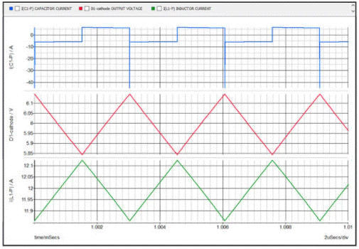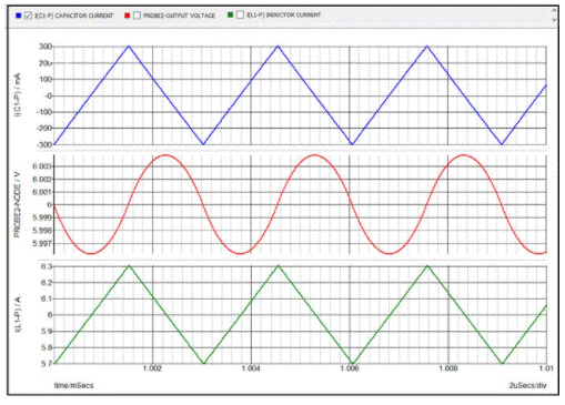 電路用Simplis 仿真,主要波形如圖2所示。藍(lán)色波形是以零為中心的 +/-300mA 峰峰值的三角電容器電流。紅色波形是以 6V 為中心的輸出電壓,具有 +/-4mV 幅度的完美正弦電壓紋波。綠色波形是 6A 的電感電流,紋波為 +/-300mA。自然,電感器和電容器的紋波電流是相同的,因為負(fù)載電流是恒定的。