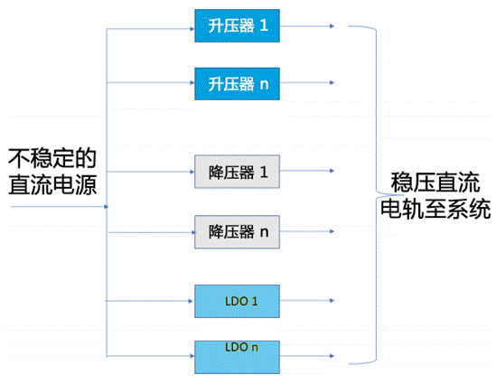 圖 1:當今的系統(tǒng)使用由升壓、降壓和 LDO 穩(wěn)壓器提供的多個直流電軌陣列,雖然它們有獨立的輸出,但操作需要配置,而且輸出在一定程度上也必須根據(jù)應用的特定需求進行協(xié)調(diào)。