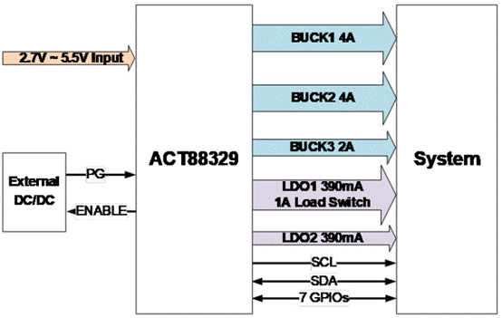 以 ACT88329 PMIC 及其評估套件為例。這款采用 30 引腳 WLCSP 封裝的 2.18mm x 2.58 mm 設備經(jīng)過優(yōu)化,不僅適用于固態(tài)硬盤 (SSD) 和現(xiàn)場可編程柵極陣列 (FPGA) 應用,還非常適合視頻處理器、FPGA、可穿戴設備、外設以及微控制器(圖 6)。