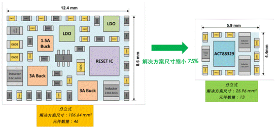 圖 5:使用 ActiveCiPS™ PMIC 系列設備的另一個好處就是高度集成,占用面積遠小于功能類似的分立式方案。