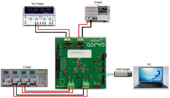 圖 7:使用 ACT88329EVK1-101 評估套件來運用 ACT88329 PMIC 需要標準的工作臺儀表以及套件隨附的 USB-to-I2C 接口電子狗。