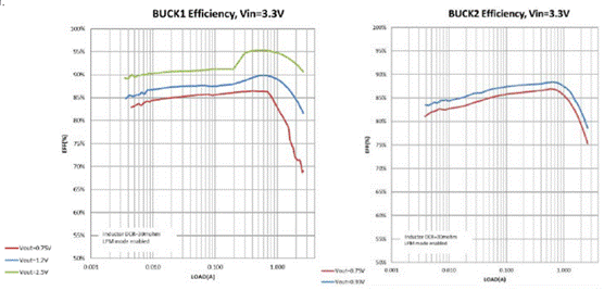 圖 11:評估套件還簡化了重要性能指標的測量,如在不同工作條件下各種 PMIC 電軌的效率,圖中所示為 ACT88329 PMIC 的 Buck1 和 Buck2。