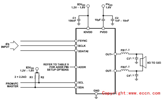 to 1.8 V (IOVDD) supply. With 1.8 V signaling, these can be shared. It can deliver 85 mW of continuous output power into a 16 Ω load with <1% total harmonic distortion plus noise (THD + N).