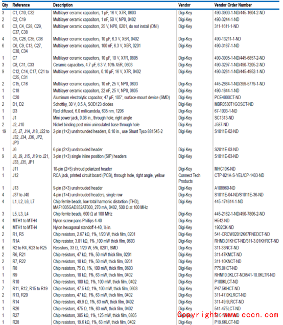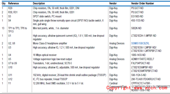ADI公司的SSM6515是高度集成高效率超低功耗單聲道D類音頻放大器,具有很適合用于無線耳機的數(shù)字輸入.應用電路僅需要很少的外接元件,工作電壓從1.8 V (PVDD)低電源和1.2V到1.8V(IOVDD)電源.這些和1.8V信令能共享.器件能向16 Ω負載提供<1%總諧波失真+噪音(THD+N)的連續(xù)輸出功率85mW.器件具有2.57 μV rms噪音, 113 dB A加權(quán)信噪比和動態(tài)范圍, 30 mW, 1 kHz輸出32 Ω 負載的THD+N為0.003%,I2C控制有多達4引腳可選擇地址或單調(diào)的操作.有多種串行數(shù)據(jù)格式,TDM,I2S或左對齊從,PDM輸入從2.8224 MHz 到12.288 MHz. 支持取樣速率從8 kHz 到 768 kHz,具有靈活數(shù)字增益調(diào)整,具有可編角頻率的DC阻隔高通濾波器,高性能模式的典型空閑功率為1.55mW,低功耗模式以降低功耗,靈活的輸出增益限制器和剪裁技術(shù),具有零數(shù)字輸入的自動降功耗特性,短路保護和雜音抑制器,用戶可選擇的超低EMI發(fā)送模式,加電復位(POR), 1.8 V PVDD電源,1.2 V 到1.8 V IOVDD電源,采用11凸0.984 mm × 1.444 mm, 0.35 mm間距WLCSP封裝.主要用在無線耳機,有源噪音抑制耳機,智能手機耳機揚聲器,助聽器和手持電子設(shè)備.本文介紹了SSM6515主要特性,功能框圖,典型應用電路圖以及評估板EVALSSM6515Z主要特性,電路圖,材料清單和PCB設(shè)計圖.
