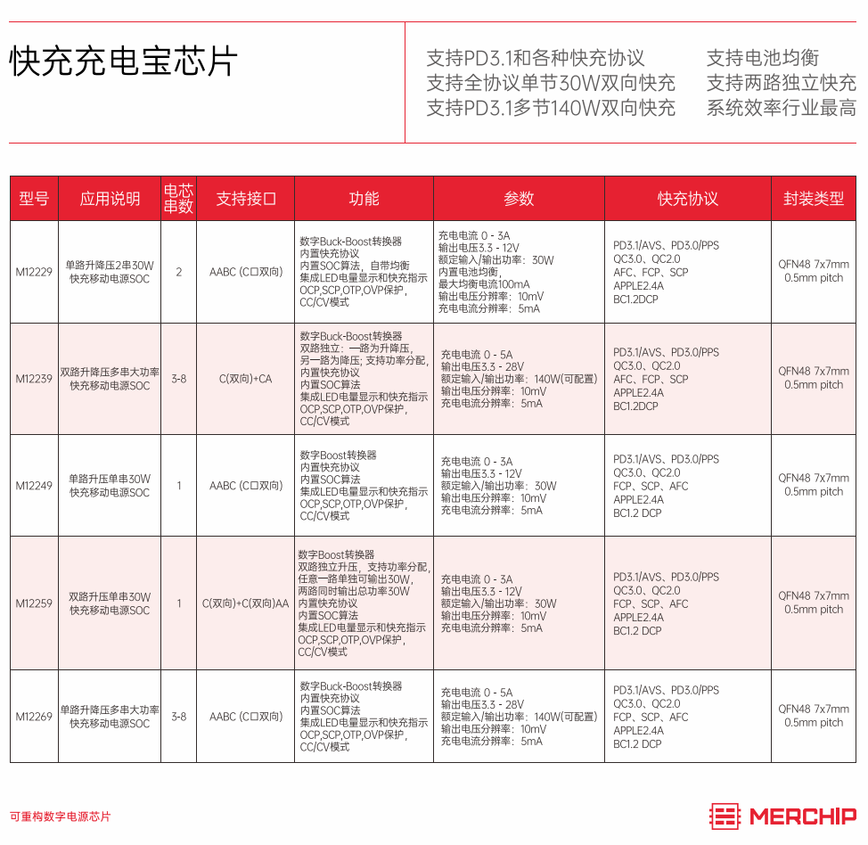 水芯電子推出的快充充電寶芯片系列,支持PD3.1和各種快充協(xié)議,可為至少單節(jié)電芯提供全協(xié)議雙向快充,其中M12239和M12269更是支持為多節(jié)電芯提供PD3.1 140W雙向快充。此外,系列中的M12239和M12259還采用了雙路獨(dú)立設(shè)計(jì),支持兩路獨(dú)立快充。