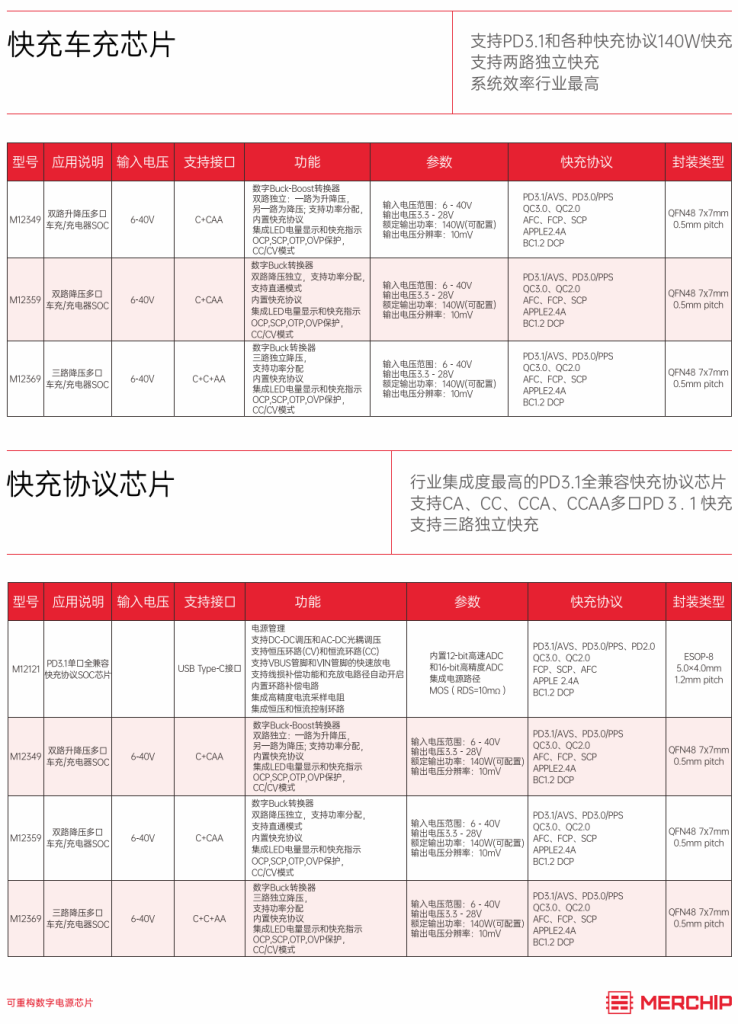 水芯推出的快充協(xié)議芯片系列,支持多口PD3.1等協(xié)議快充。值得一提的是,系列中的M12349、M12359、M12369三款產(chǎn)品還可應(yīng)用在車充產(chǎn)品中。