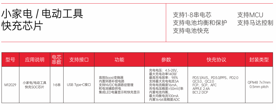 針對(duì)電動(dòng)工具和小家電市場,水芯推出了M12029快充SOC芯片,支持1-8串電芯,集成高效Boost變換器,支持NVDC電源路徑管理和電池輔助供電,支持馬達(dá)控制,支持MCU,內(nèi)置環(huán)路補(bǔ)償電路,集成LED電量顯示和快充顯示。