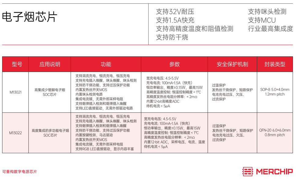 水芯電子針對(duì)電子煙市場,推出了M13021和M13022兩款電子煙芯片,這兩款芯片支持MCU、32V耐壓、1.5A快充電流、高精度溫度和阻值檢測、咪頭檢測、防干燒等眾多特性。