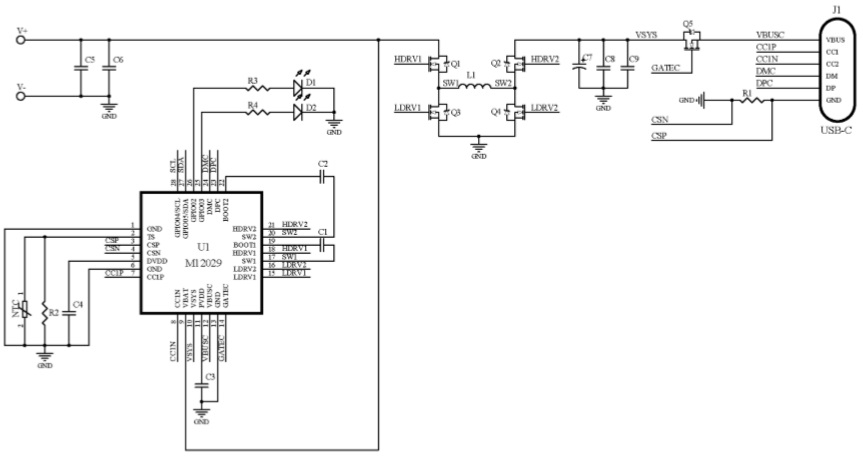 M12029 是一款面向小家電/電動工具快充的專用SOC,集成了同步開關(guān)升壓變換器、快充協(xié)議控制器、電池充放電管理、電池電量計算、電量顯示、電機控制等功能模塊,支持PD3.1、QC3.0、AFC、FCP、SCP等快充協(xié)議,最大充電功率140W,并提供輸入過壓/欠壓、過溫、過流保護等完備的保護功能。配合簡單的外圍電路,即可組成2-8串鋰電池及磷酸鐵鋰電池的快充方案。