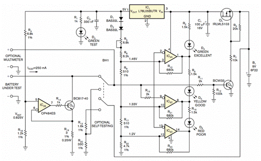 連接電池進(jìn)行測(cè)試時(shí),應(yīng)至少測(cè)試 5 秒。 如果電池處于相對(duì)正常的狀態(tài),LED D 3會(huì)亮起。在這種情況下,開(kāi)關(guān) Q 1 為電池測(cè)試儀供電。由 IC 2A 和 Q 3組成的灌電流發(fā)生器 為被測(cè)電池加載,電阻分壓器網(wǎng)絡(luò)設(shè)置比較器電壓。