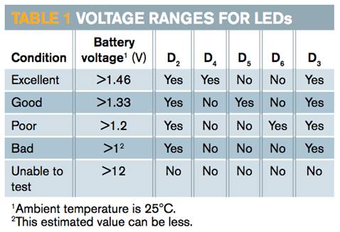 當(dāng)我們連接被測(cè)電池時(shí),Q 2 開(kāi)啟,然后 Q 1開(kāi)啟,將來(lái)自 9V 電池的電壓施加到穩(wěn)壓器。該動(dòng)作點(diǎn)亮D 3,表示待測(cè)電池有足夠的電壓進(jìn)行測(cè)試。LED D 4、 D 5和 D 6 指示電池的狀態(tài)。表 1 顯示了這些 LED 點(diǎn)亮所需的電壓范圍。
