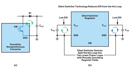 圖1. (A) 異步單芯片升壓轉(zhuǎn)換器具有單個(gè)熱回路,其中包含一個(gè)外部續(xù)流二極管。(b) Silent