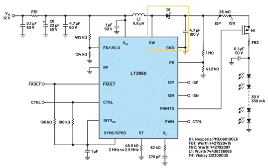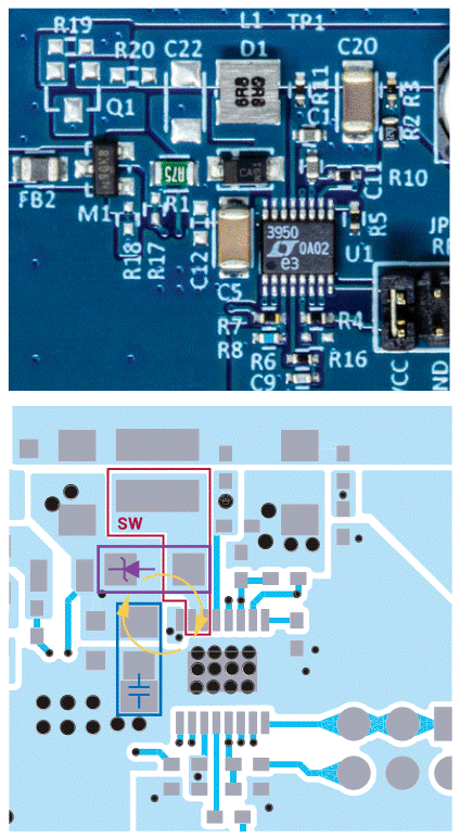 LT3950 LED驅(qū)動(dòng)器是一個(gè)異步單芯片1.5 A、60 V升壓轉(zhuǎn)換器。升壓轉(zhuǎn)換器熱回路(黃色突出顯示)包含一個(gè)分立式續(xù)流二極管,不會(huì)減弱高頻率輻射。
