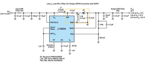 SEPIC還是能保持低輻射。EVAL-LT8334-AZ SEPIC 12 VOUT 評(píng)估套件也使用2