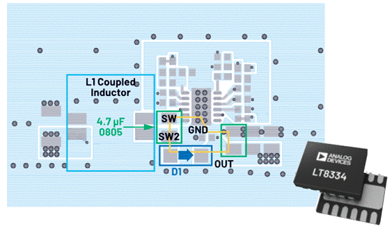 (EVAL-LT8334-AZ)的熱回路布局中包含這個(gè)微型DFN、一個(gè)陶瓷耦合電容、一個(gè)陶瓷輸出電容和一個(gè)小型續(xù)流二極管。
