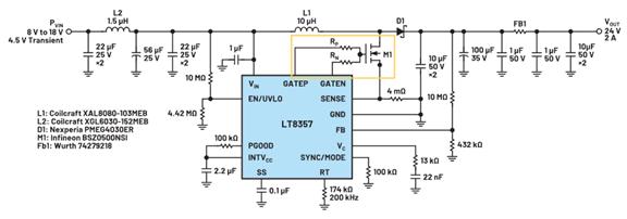 Ω電阻RP(在GATEP上)就足以降低M1功率MOSFET的開啟邊緣速率,并將電磁輻射騷擾保持在盡可能低的水平。當(dāng)然,一些輻射濾波器和SSFM也有助于減少輻射。EVAL-LT8357-AZ評(píng)估板還額外留出了輻射屏蔽位置,但對(duì)于大部分應(yīng)用,可能沒有必要。這個(gè)異步升壓控制器與它的單片式版本非常相似,具有高功率、低EMI升壓和SEPIC應(yīng)用所需的所有功能。