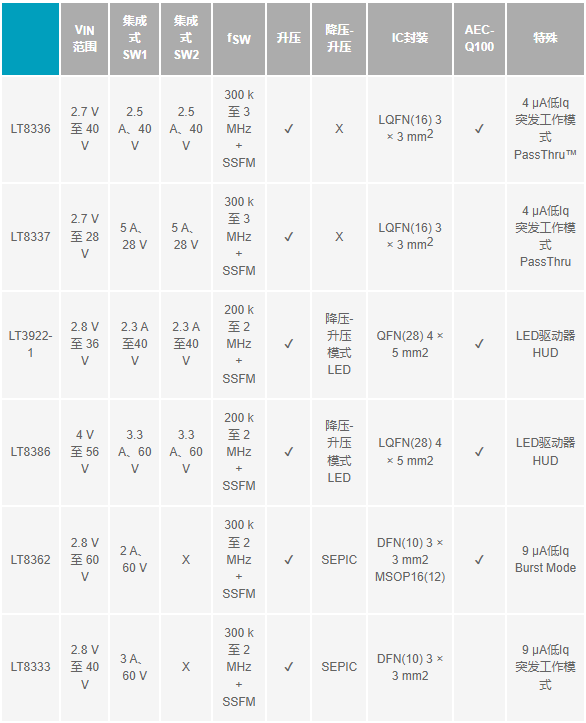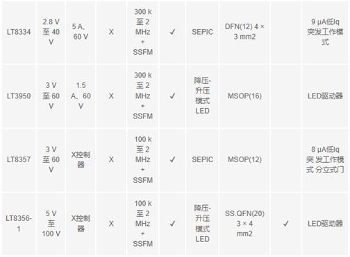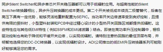 MHz和SSFM,能提供低輻射。EVAL-LT8357-AZ升壓控制器可以實(shí)現(xiàn)相似的性能。有關(guān)這些器件的完整輻射結(jié)果、原理圖和測(cè)試選項(xiàng),可以訪問analog.com,查看對(duì)應(yīng)的產(chǎn)品登錄頁(yè)面。表1列出了一個(gè)新的低EMI異步升壓和SEPIC轉(zhuǎn)換器系列。單芯片IC和控制器IC結(jié)構(gòu)簡(jiǎn)單、成本低,采用多種拓?fù),具有大功率功能和低輻射,因此非常?shí)用。當(dāng)超低輻射成為首要的要求時(shí),也可以使用高電流Silent