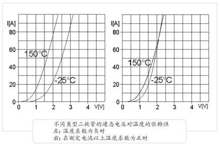 判斷一個二極管是否適合并聯(lián)的重要參數(shù)是其通態(tài)電壓對溫度的依賴性。如果通態(tài)電壓隨溫度的增加而下降,則它具有負的溫度系數(shù)。對于損耗來說,這是一個優(yōu)點。