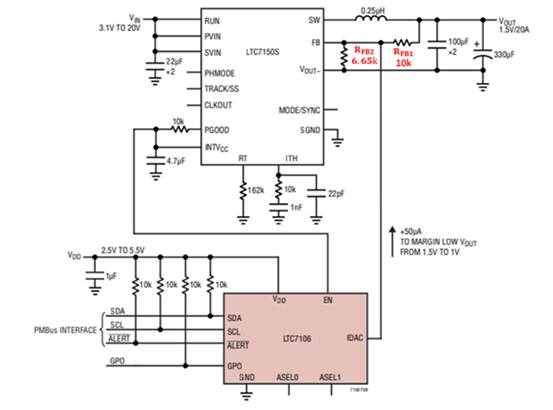 如下圖,使用LTC7150S作為DC-DC開關穩(wěn)壓器,提供1.5V電壓輸出。假設我們現(xiàn)在需要電源在1.5V到1.0V之間對電源輸出電壓進行動態(tài)調整。