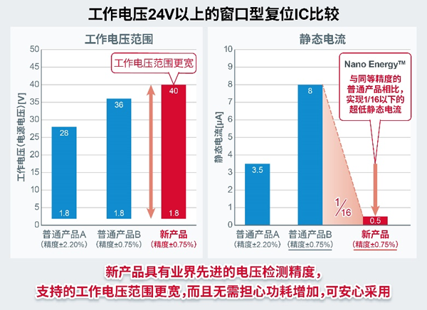 此外,通過采用超低靜態(tài)電流技術(shù)“Nano Energy™”,實(shí)現(xiàn)了500nA(0.5µA)的超低靜態(tài)電流,僅為具有同等功能和精度的普通產(chǎn)品的1/16,因此還可以用于擔(dān)心功耗增加的應(yīng)用產(chǎn)品中。