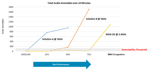 從歷史上看,在擁塞度為50%的環(huán)境中能夠運行的無線音頻解決方案即被認為是非常好的方案。WiSA的解決方案能夠在擁塞度為75%的環(huán)境中運行,是無線音頻技術(shù)的重大突破。